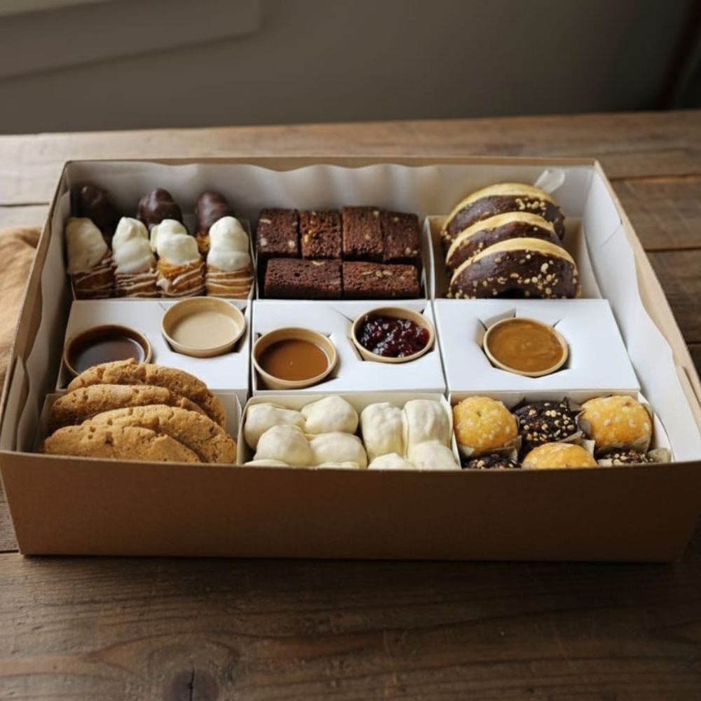 El material con el que está fabricada la caja en la que se entregan todos nuestros desayunos es cartón y se personaliza con el motivo que seleccione el cliente en los desayunos en los que existe la opción de escoger el diseño de la caja.