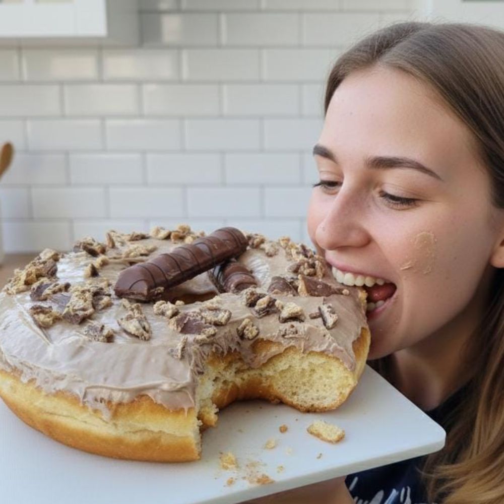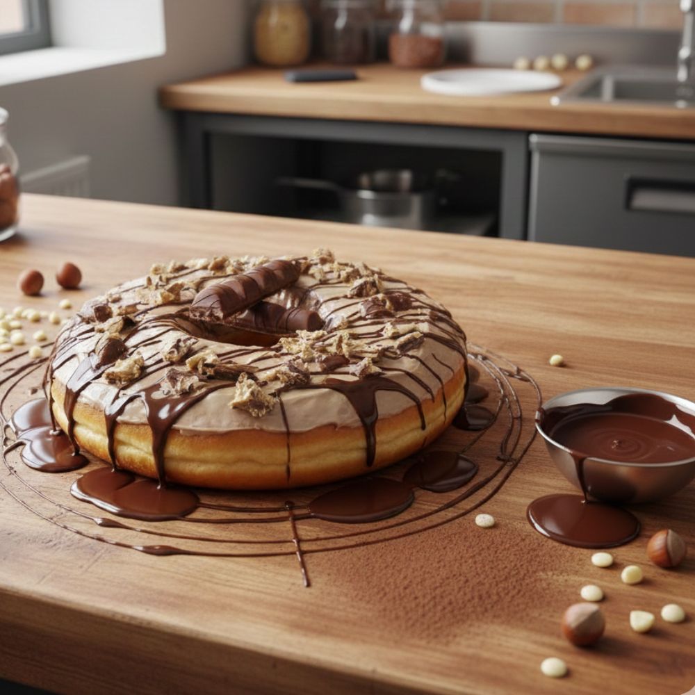 Si eres amante del chocolate… prepárate. Nuestro Konut Gigante Kinder Bueno es una auténtica obra maestra pensada para sorprender desde el primer vistazo. Elaborado con una masa esponjosa tipo donut XXL, va cubierto con una cremosa capa de chocolate estilo Kinder y coronado con trozos generosos de Kinder Bueno, que aportan ese toque crujiente y avellana que tanto nos encanta.